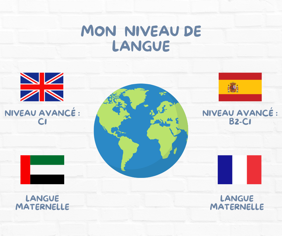 Actuellement, je me distingue par ma capacité à communiquer aisément en quatre langues : arabe, français, espagnol et anglais. Cette polyvalence linguistique est directement en phase avec mes objectifs professionnels, visant des rôles clés dans le commerce international, tels que chargé d’import-export ou chargé d’affaires internationales. Cette aptitude me permet d’interagir sans frontières, d’étendre mon réseau global et d’embrasser pleinement les nuances du commerce multiculturel.